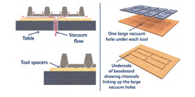 Raising a tool/mould off the baseboard by 1mm, instead of drilling vacuum holes all-round the perimeter of the tool, will produce a much stronger vacuum flow and greater air release pressure.